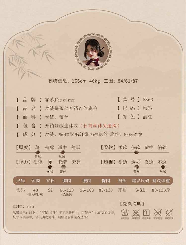 中国霏慕 – 丝绒拼蕾丝开档连体旗袍 均码 [酒红]