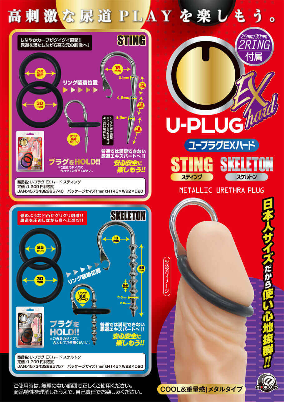 「U-PLUG EX HARD SKELETON」專為尿道進階玩家打造。插入段採骨感螺紋設計,由細至粗的節點在每一次前進與後退間製造明確卡點,沿壁形成連續壓迫,節奏感鮮明而上癮。金屬材質帶來紮實重量回饋與冷感導溫,搭配溫熱潤滑或溫差玩法可快速拉高敏感度;附贈兩枚不同內徑固定環,鎖住最佳貼合點,穩定角度更安心。建議以足量水性潤滑、從淺入深循序擴張,並時刻傾聽身體訊號,在可承受範圍內享受更高一階的精準強度。