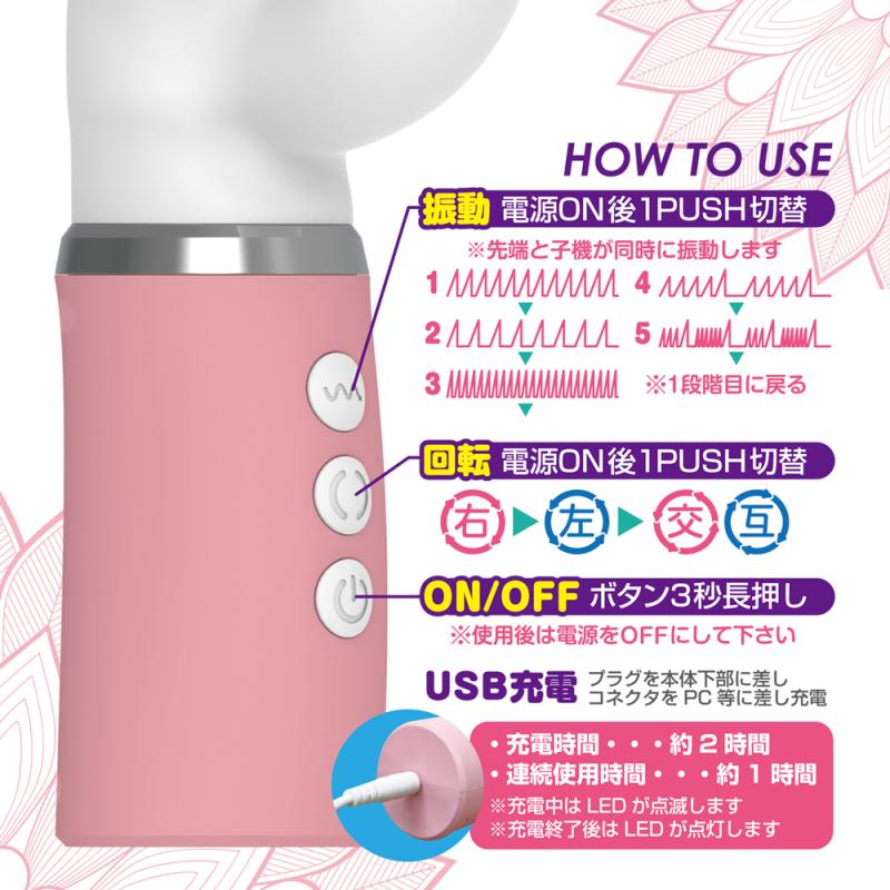 | 電池:USB充電(約120分鐘完成充電/約60分鐘連續運行) 功能:震動、旋轉(可同時運行) 模式:震動 5 段、旋轉 3 段 材質:ABS、TPE 防護:生活防水 |