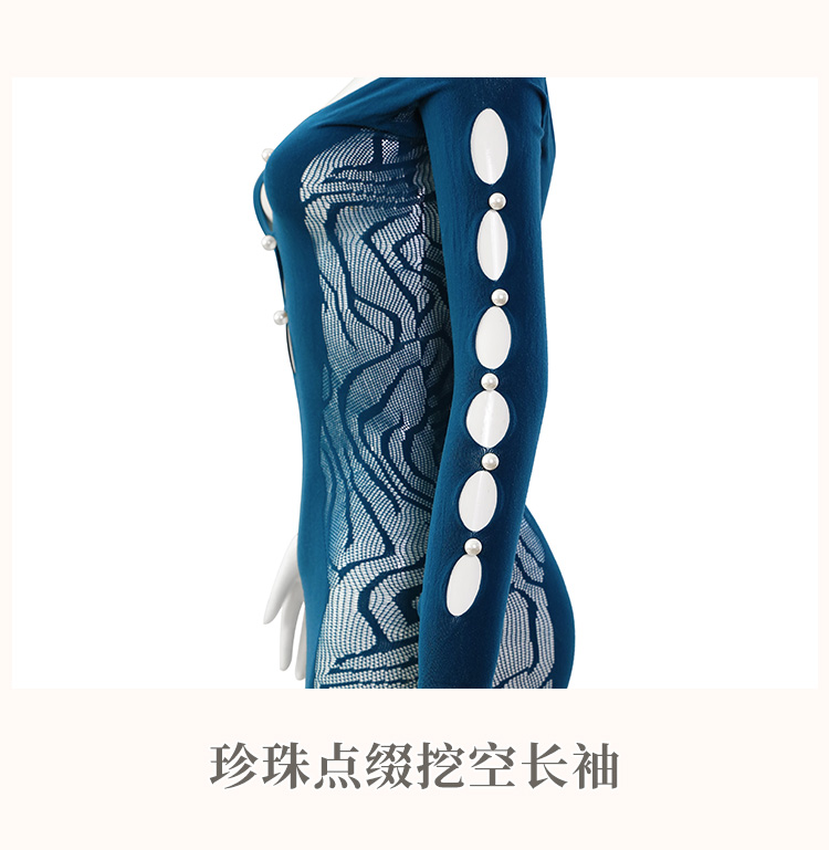 霏慕 – 典雅曲線款 水月明珠網眼修身包臀情趣裙【孔雀蓝】