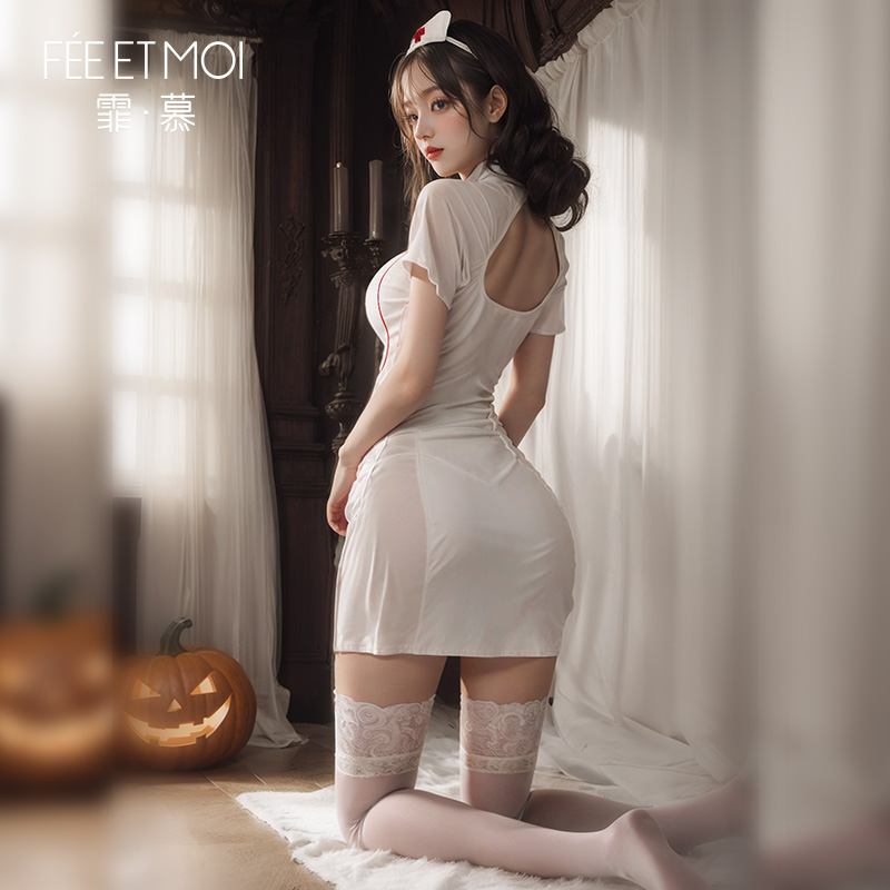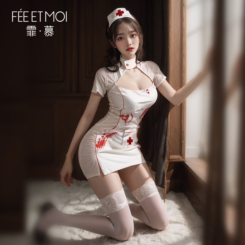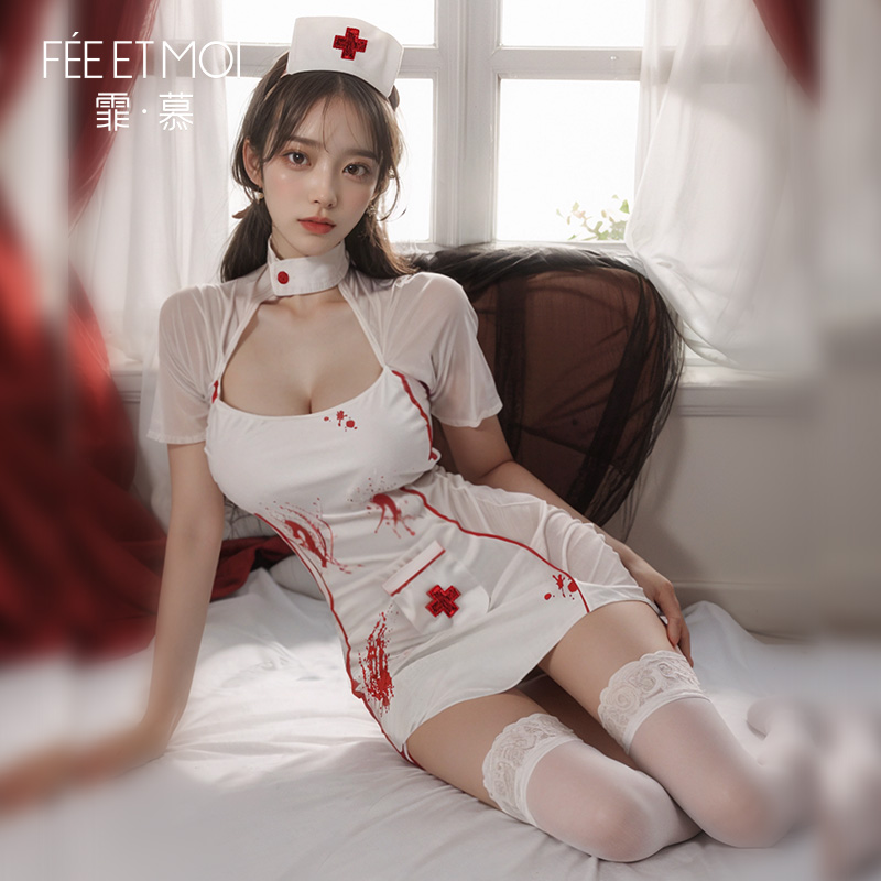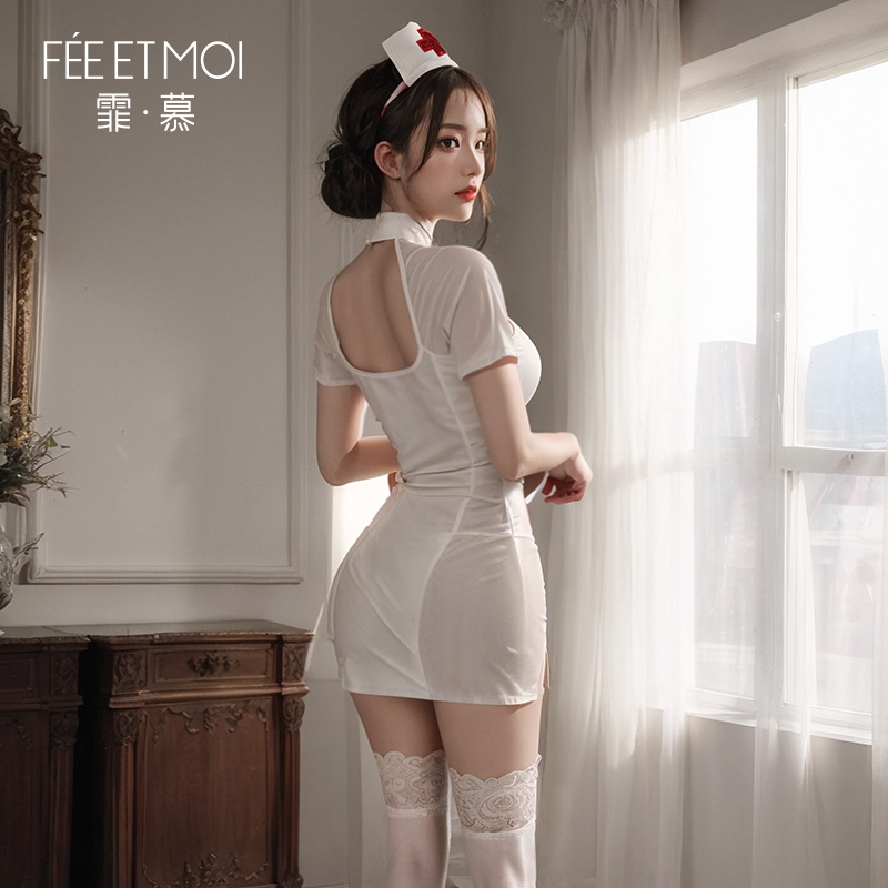 中国霏慕 – 暗夜小護士 誘人露溝透視制服COS護士派對套裝 [均碼]