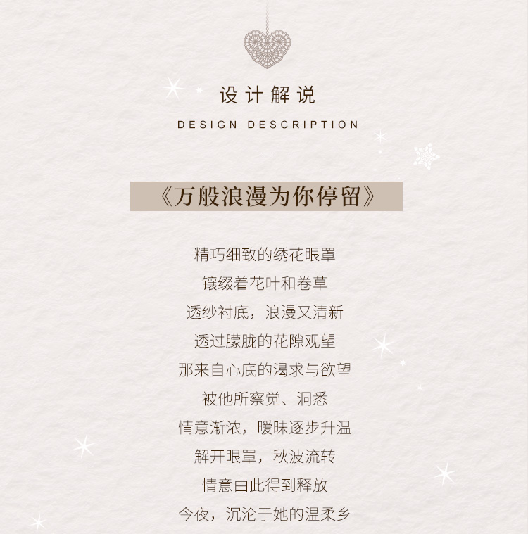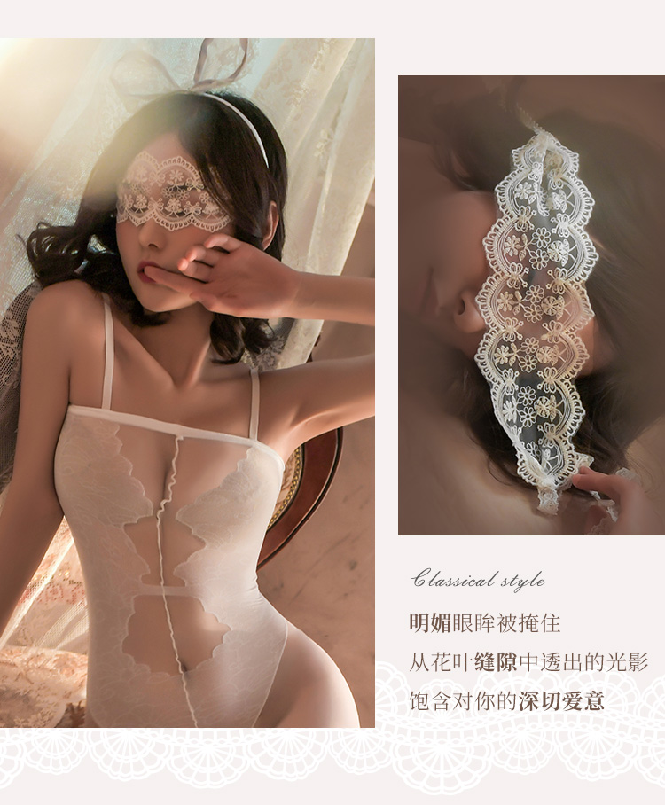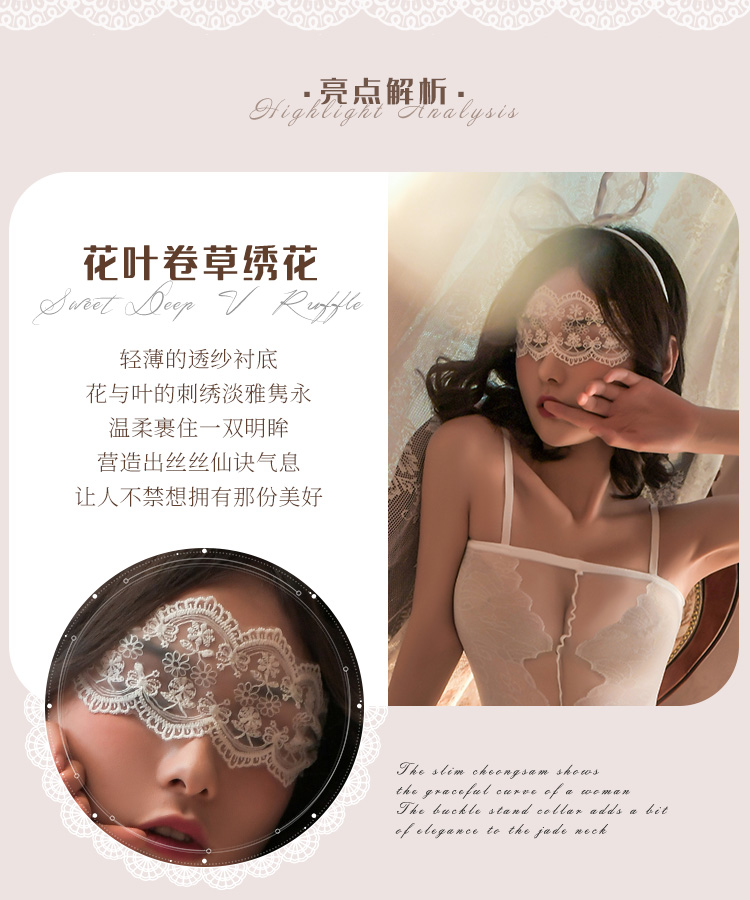 柔美睫毛蕾絲搭配深V吊帶剪裁,輕盈包覆之間展現優雅與性感,讓每一夜都瀰漫浪漫情慾氛圍。