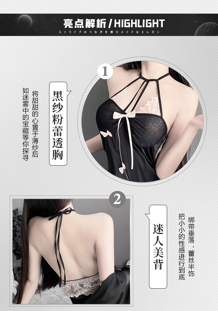 輕柔紗質與細膩蕾絲交織包覆,半透視設計若隱若現展現純欲魅力,溫柔中藏不住撩撥氣息,輕鬆營造私密調情氛圍。