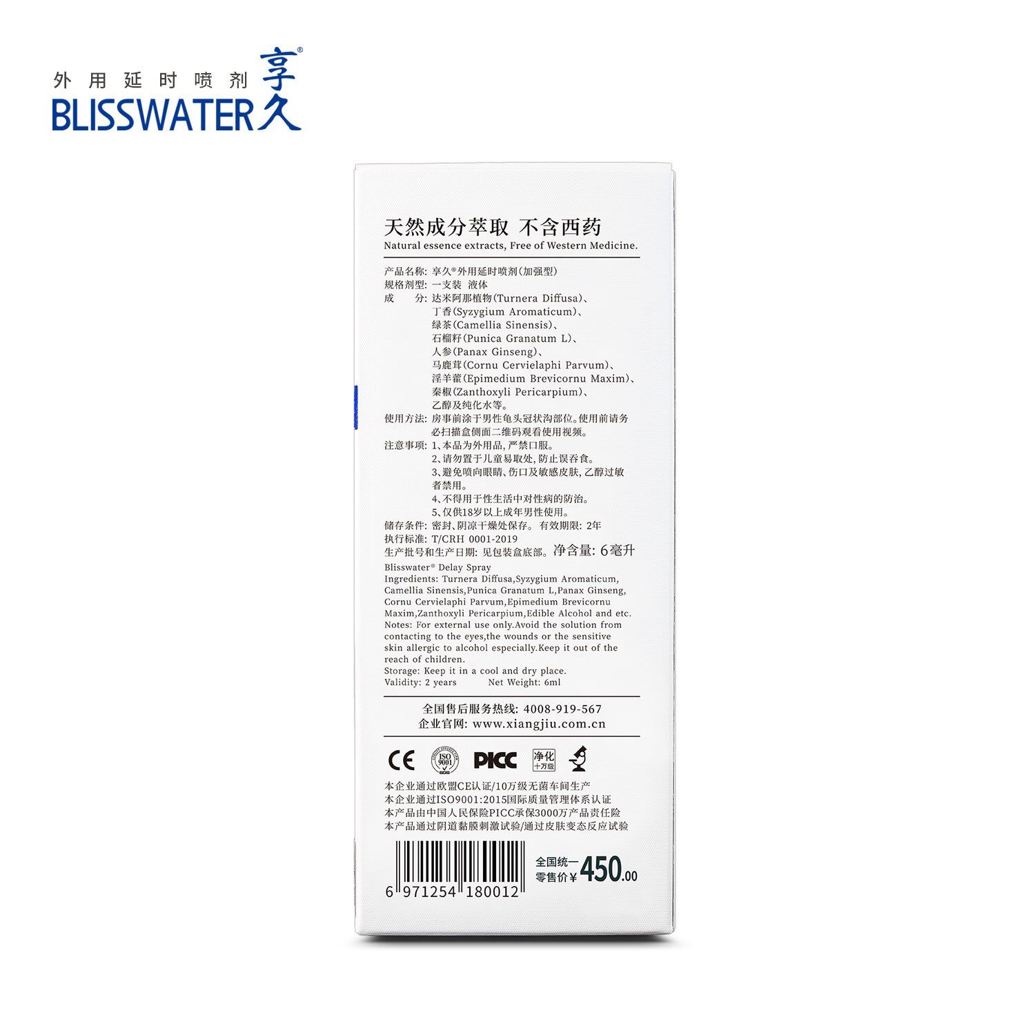 『享久延時原液噴霧2代加强款 6ml』吸收起效时间约30分钟,效果持续时间12小时,平均可延长射精时间约45分钟~2小时,从“延时效果”,“吸收时间“,”效果持续时间”,”硬度“,”麻木感“等综合评测都均高于『龙水加强款』,『2H&2D黑金版』,『安太医加强版』等所有品牌,仅“对快感的影响”这一点略低于『龙水加强款』。而且口交女方无察觉,是所有延时类产品中最顶级的一款产品!