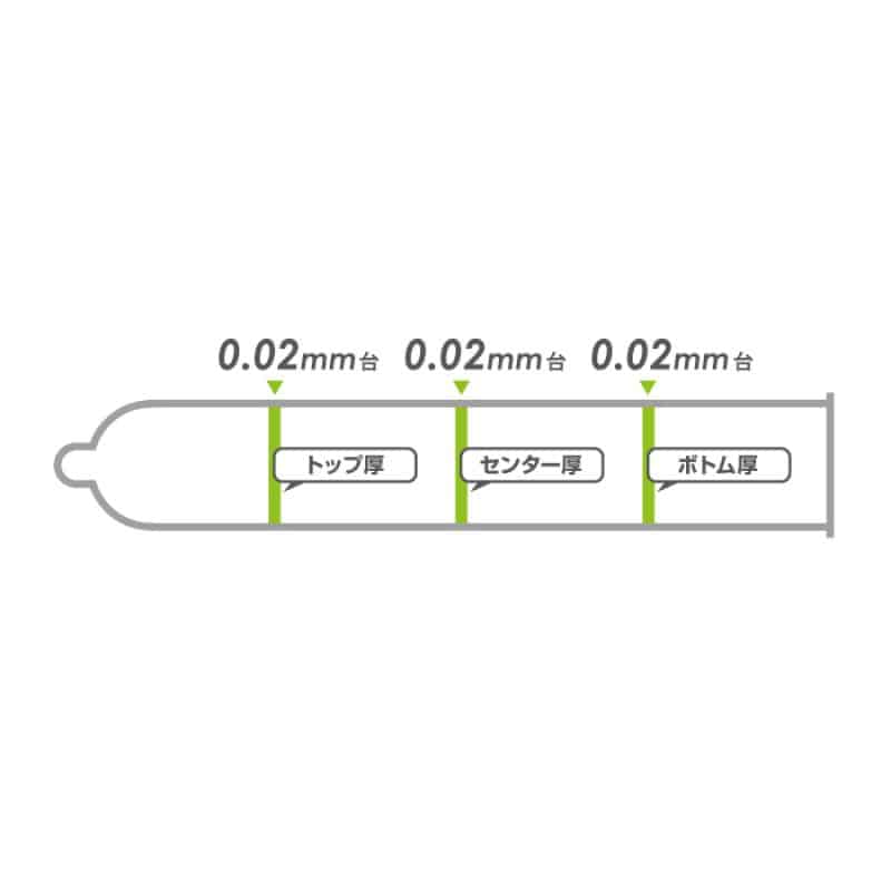 岡本安全套 002(零二)根據 ISO 標準 (*) 測量距離尖端 30 毫米的頂部厚度、中心厚度和距離根部 30 毫米的底部厚度。這種測量方法在岡本被稱為「三點測量」,它已被用作領先於其他公司的避孕套測量標準。002(零二)是通過三點測量實現0.02毫米均勻厚度的避孕套。