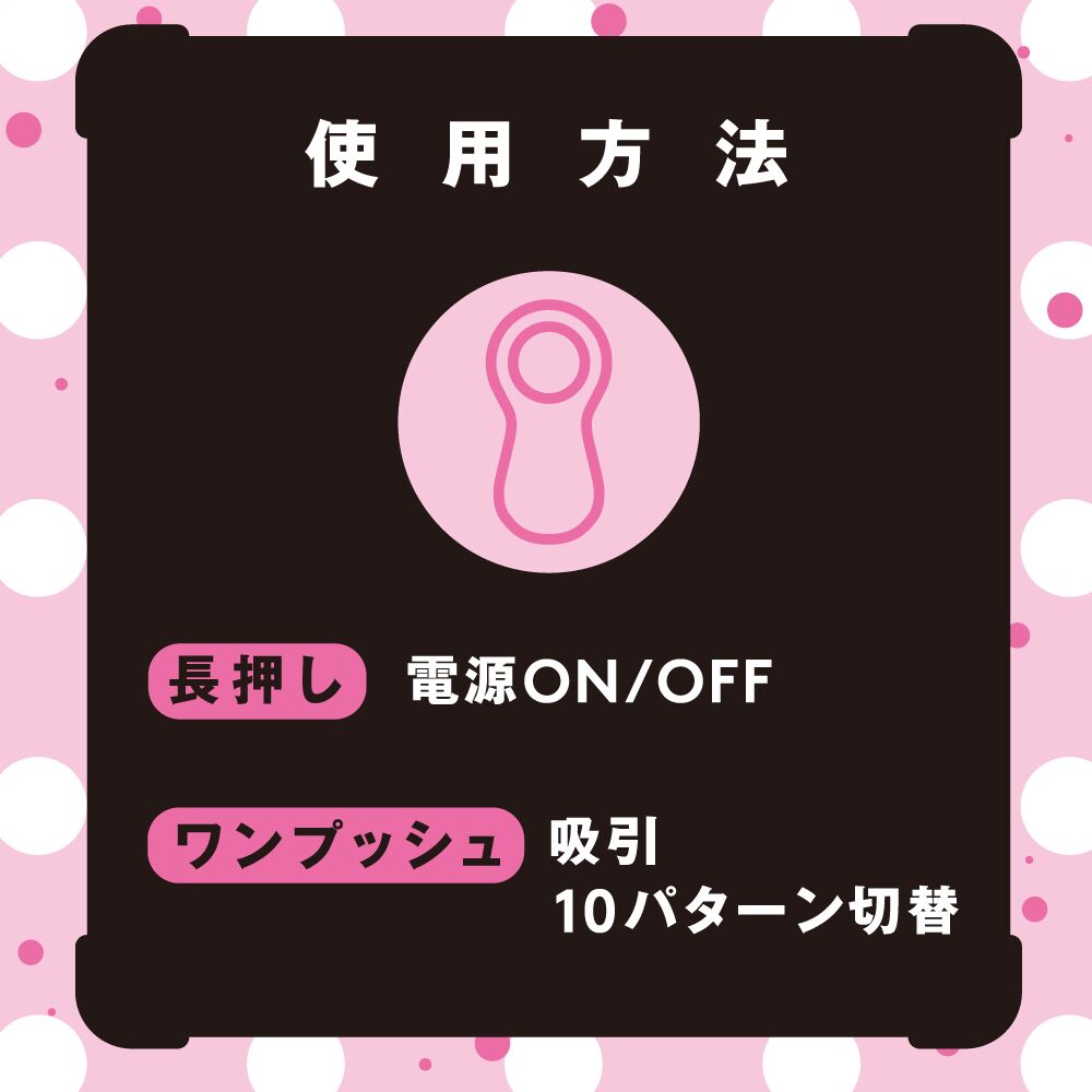 | 電池:USB充電(約40分鐘完成充電/最長約150分鐘連續運行) 充電中:指示燈閃爍,充電完成時:指示燈常亮 功能:吸吮 吸吮模式:10種模式 強度段數:2段階(包含在模式中) 防水等級:IPX5 生活防水 材質:矽膠、ABS |