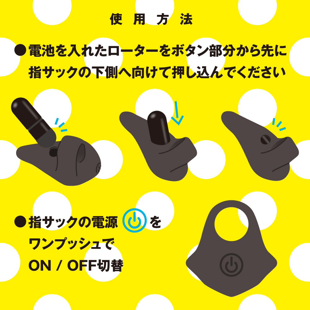 | 電池:LR41 鈕扣電池 ×3(隨附,電池可更換) 功能:振動(指尖裝載式迷你轉子) 振動:1 種模式 強度:無段調整(固定輸出) 特性:完全防水、靜音設計 材質:矽膠(指套)、塑料轉子 |