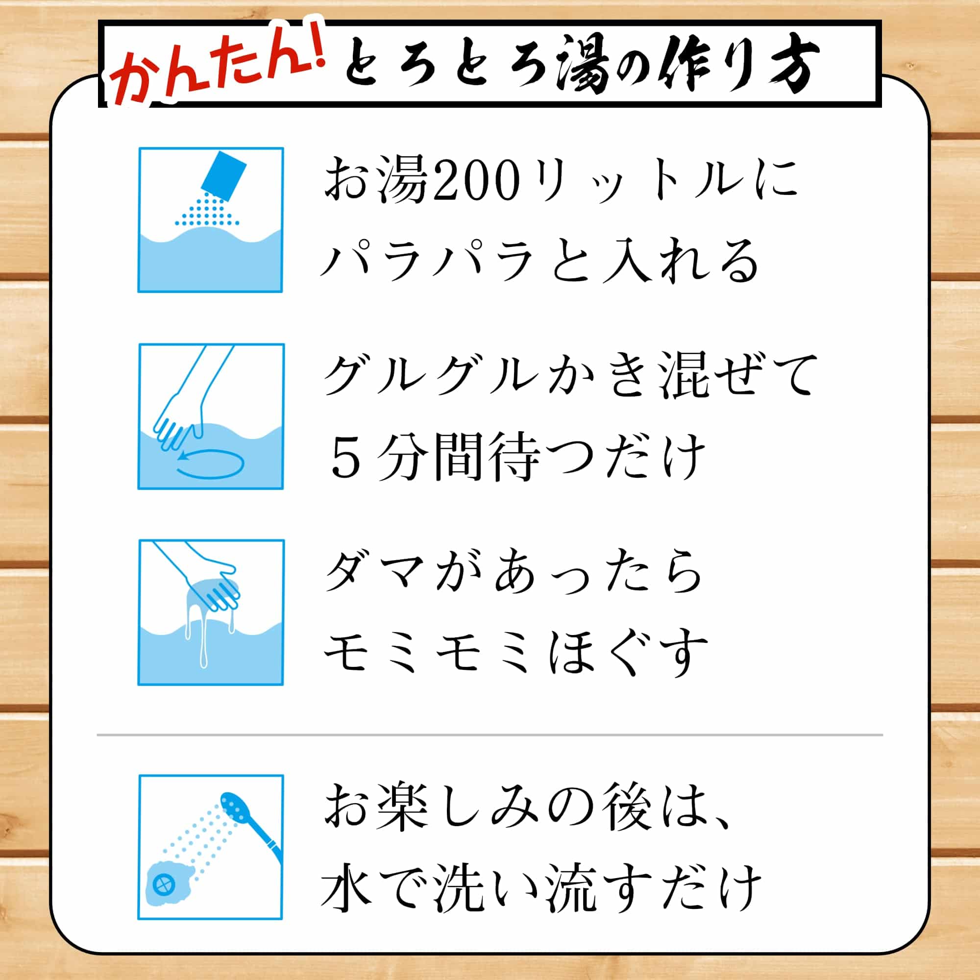 | ♨ 使用說明 將1包本產品放入160-200升熱水中,充分攪拌使其溶解並享樂。融化後,等待約5分鐘,您將得到一個充滿光澤的鏡面缸水。使用不同數量會産生不同變化,請享受這調整過程的樂趣,如果熱水的量太少而無法完全溶解,請用手搓揉結塊會更容易溶解。 ※ 浸浴完畢請沖洗身體,使用過程中請注意防滑。 ■ 產品尺寸 : H140×W100×D10mm |