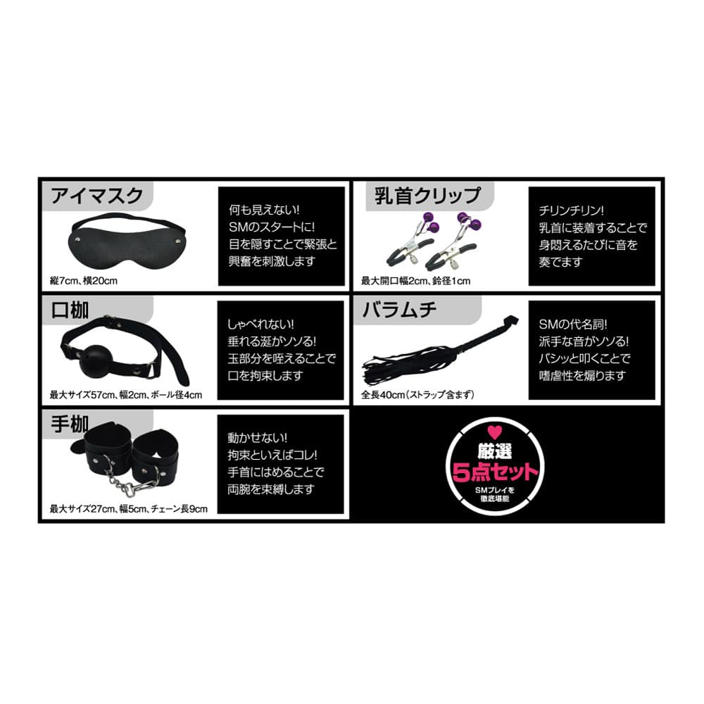享受SM遊戲的嚴選5點組合「SMV」!這是適合想要開始SM遊戲的初學者的SM商品組合。增強感受的「眼罩」,增強觀感的「嘴巴鐐銬」,限制動作的「手銬」,不斷扭動的「乳頭夾」,以及啪啪作響的「皮鞭」。所有5個精心挑選的物品,讓您立即開始SM PLAY。