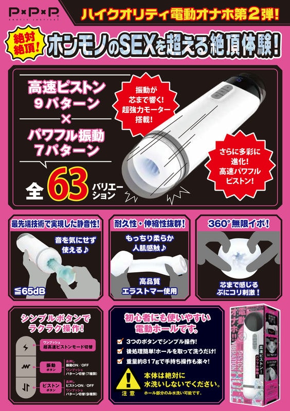 初學者也能輕鬆上手使用,最受歡迎的「日本HATOPLA – PISTON VIBRATION HOLE 真實性愛伸縮振動高品質全自動飛機杯 2」超講究的伸縮式電動飛機杯體驗真正的性愛!9種高速伸縮模式×振動7種模式,總共63種變化!採用尖端技術,強力卻安靜的伸縮!快感不僅僅是激烈,還有精緻而技術性的伸縮帶來的絕妙快感!3個按鈕操作簡單!用後處理簡單,只要把自慰套取出來清洗。重量約880g,可輕鬆手持操作!由於內部會直接接觸肌膚,我們使用了注重安全性和觸感的高品質彈性體。不要猶豫,快來享受這超絕的伸縮震動體驗吧!