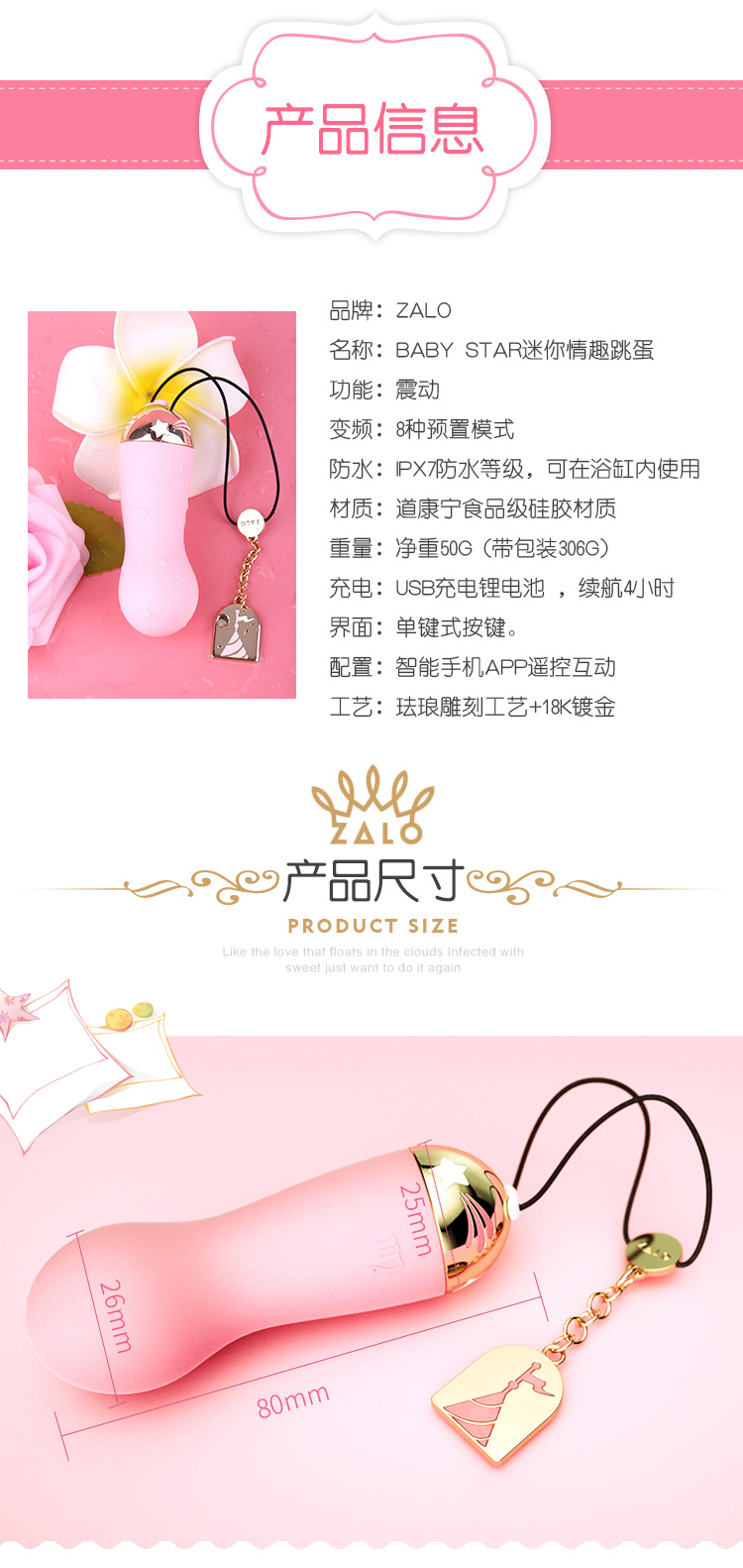只有我們,還是您也注意到玩具不是很……漂亮?ZALO是一華麗的高端成人產品系列,每件產品都具有引人注目的美感。 鍍金、珠寶級手工琺瑯加工,歷經65道工序細心製作,真正的施華洛世奇水晶觸感和絲滑的道康寧食品級矽膠等細節,每一件產品都是一場視覺盛宴,就像您的其他感官一樣。致力於打造最高端豪華的成人玩具,ZALO 給您最美麗的那個她誠意獻上精心設計打造 「ZALO – 蘿莉塔系列 BABY STAR 18K鍍金八頻迷你按摩調情跳蛋 粉色 [支持APP]」。
