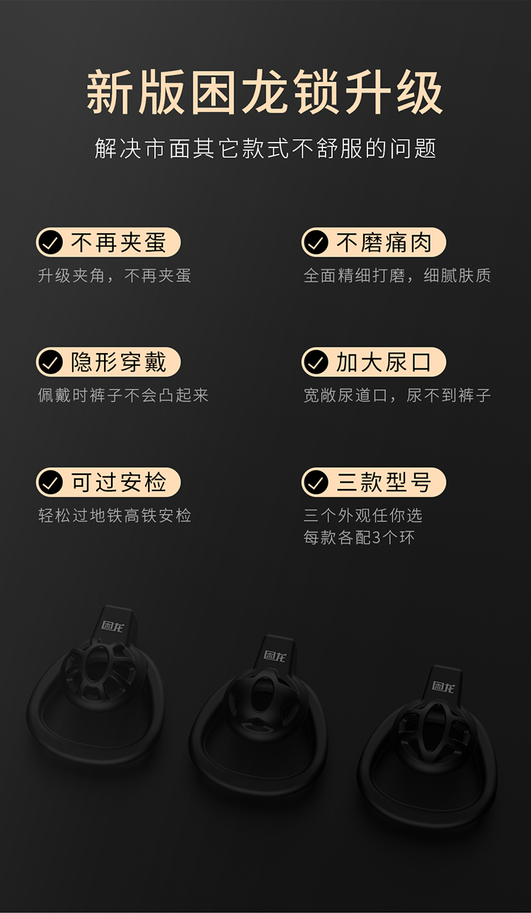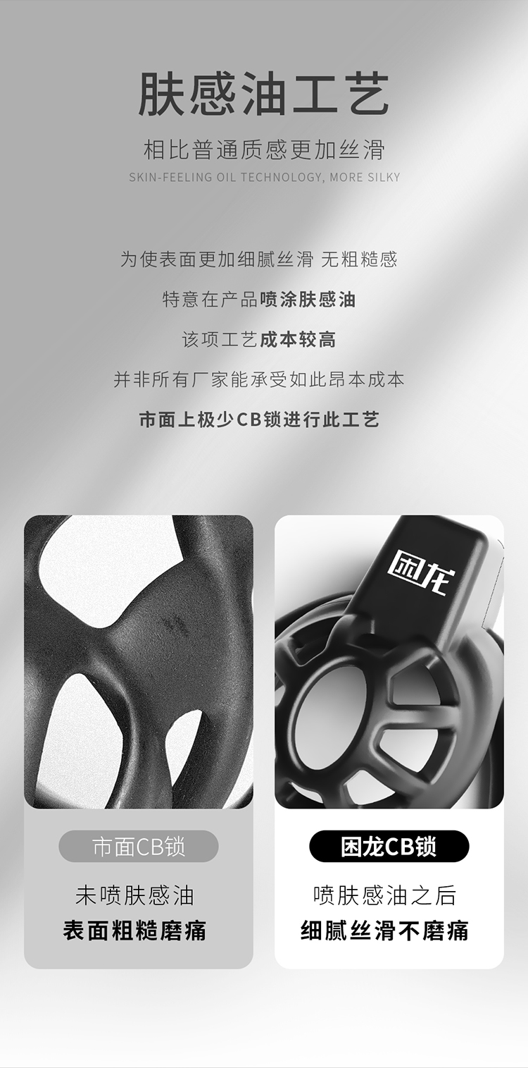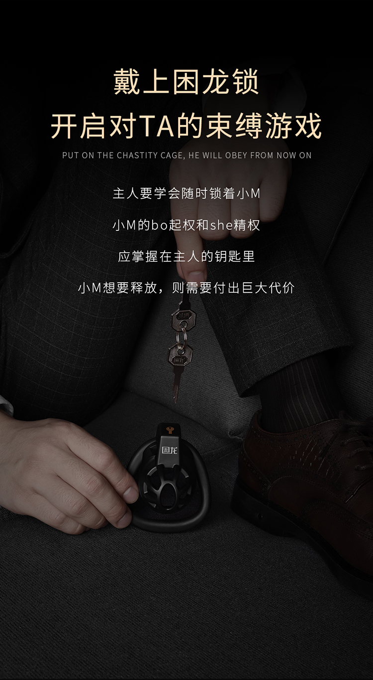 JEUSN – 主僕調教遊戲神器 隱形穿戴困龍CB鎖 【鍋頭黑蓋款】是一款專為S/M情侶調教玩法而設計的男用束縛裝置。外觀採鍋頭黑蓋式隱形結構,升級ABS堅固材質,整體堅韌抗裂,長時間佩戴依然穩固舒適。配合多處細節打磨工藝及加寬夾角設計,避免傳統CB鎖卡蛋或壓迫不適。表層更特別噴塗膚感油,使整體觸感更加細膩柔滑,有效降低摩擦不適,適合長時間束縛遊戲。可選配遠程鑰匙保管盒,實現遠端授權開鎖、雙人綁定及任務定時解鎖,遠距異地戀也能進行情慾掌控。三款不同外型配置三種尺寸鎖環,滿足不同體型需求,打造你的專屬支配儀式。